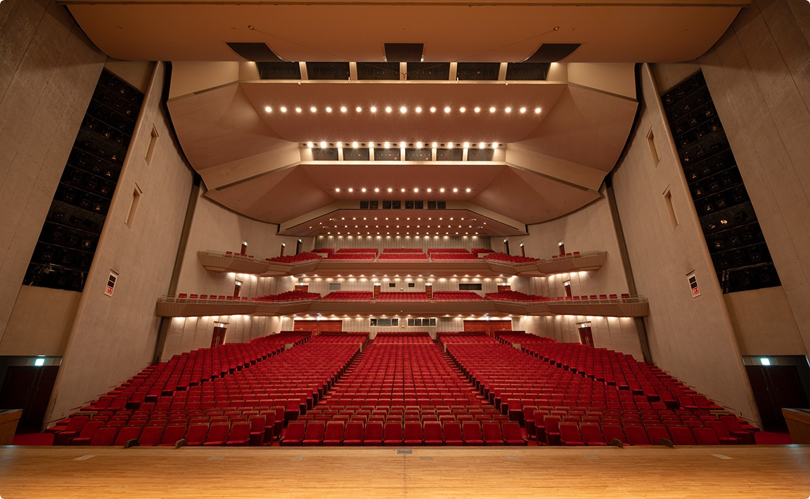 | コンサートホール | 面積:舞台部分 917m2、客席1F 1,106m2、2F 294m2、3F 429m2 合計2,746m2 客席:総数2,316席 1階席1,468席(ピット席124)・2階席360席・3階席488席 ※車椅子コーナー6席 |