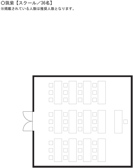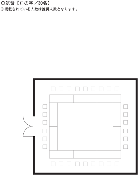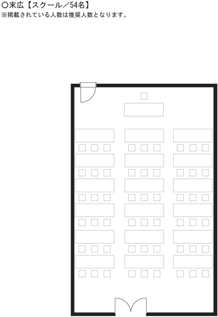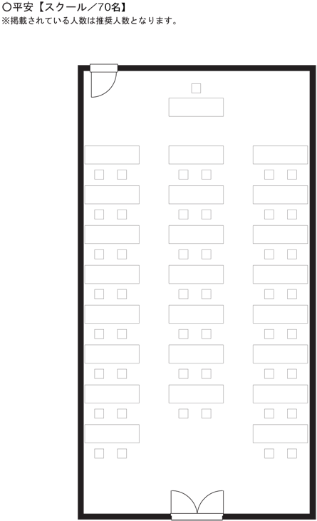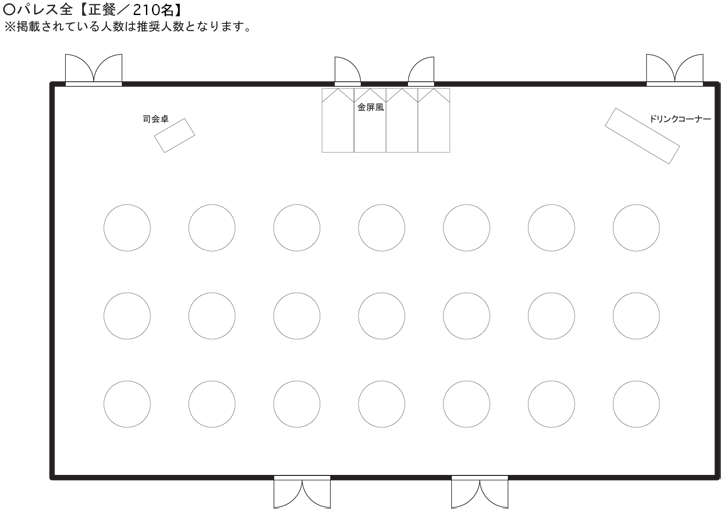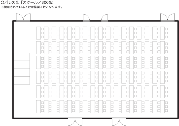 | パレスルーム全体 | m2(坪):396(120) | 天井高:6 | 立食:300名 | 正餐:210名 | スクール:300名 | ロの字:110名 | シアター:480名 |