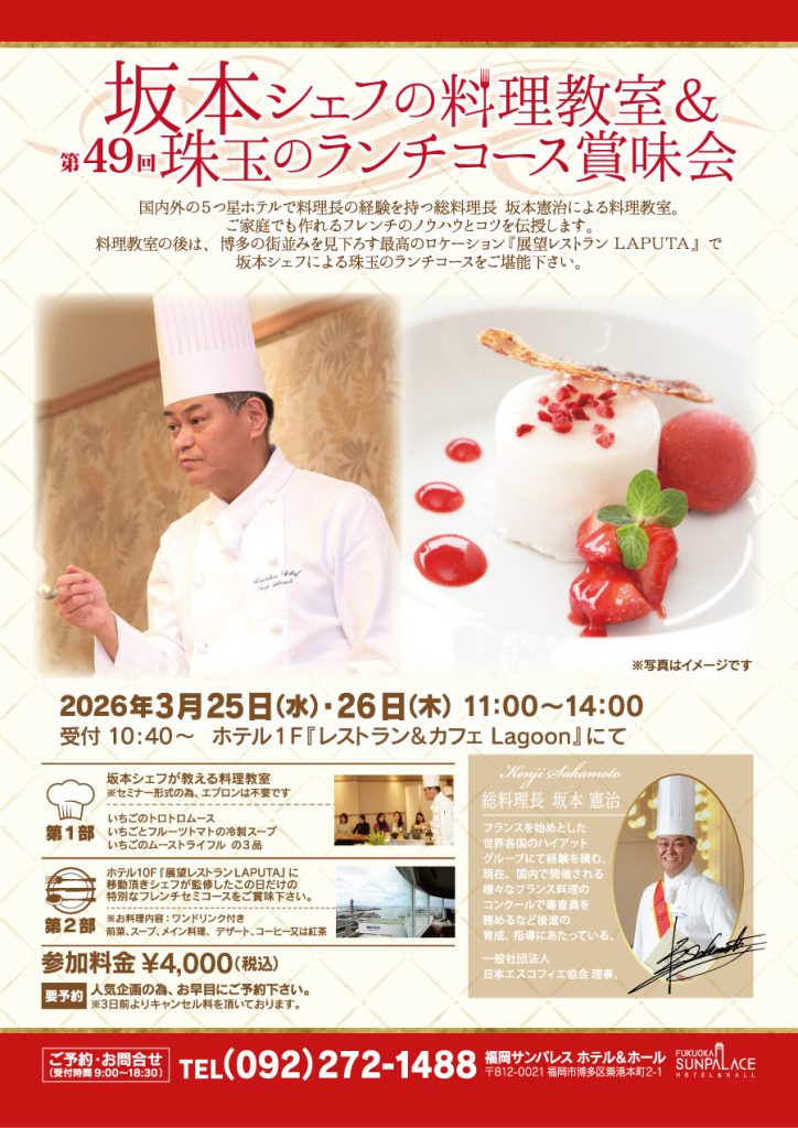 - 国内外の5つ星ホテルで料理長の経験を持つ総料理長 坂本憲治による料理教室。ご家庭でも作れるフレンチのノウハウとコツを伝授します。料理教室の後は、博多の街並みを見下ろす最高のロケーション「展望レストラン LAPUTA」で坂本シェフによる珠玉のランチコースをご堪能下さい。