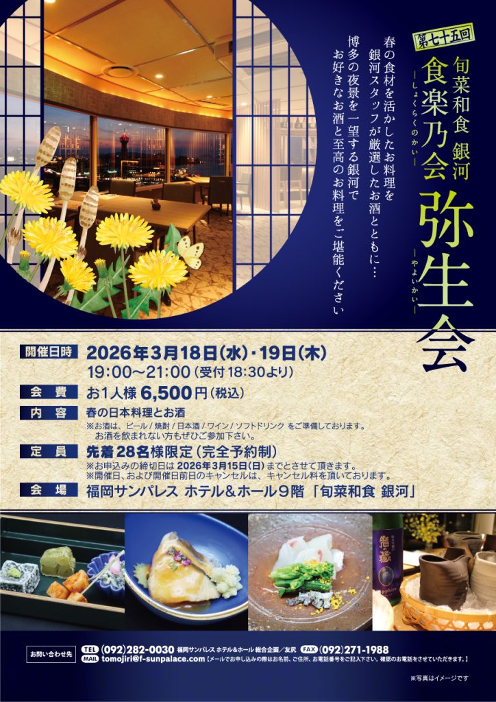 博多の夜景を一望する銀河で、お好きなお酒と至高のお料理をご堪能ください。 - 開催日時