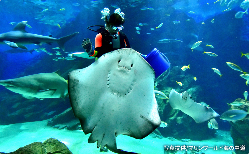 周辺を海と公園に囲まれた、市街地の喧騒から離れた自然豊かな環境にあるマリンワールド海の中道。博多湾を背景としたショープールで、迫力あるイルカやアシカショーが楽しめる他、大型のサメやエイ、マイワシの群れが泳ぐ外洋大水槽では魚の餌やりも見ることが出来ます。