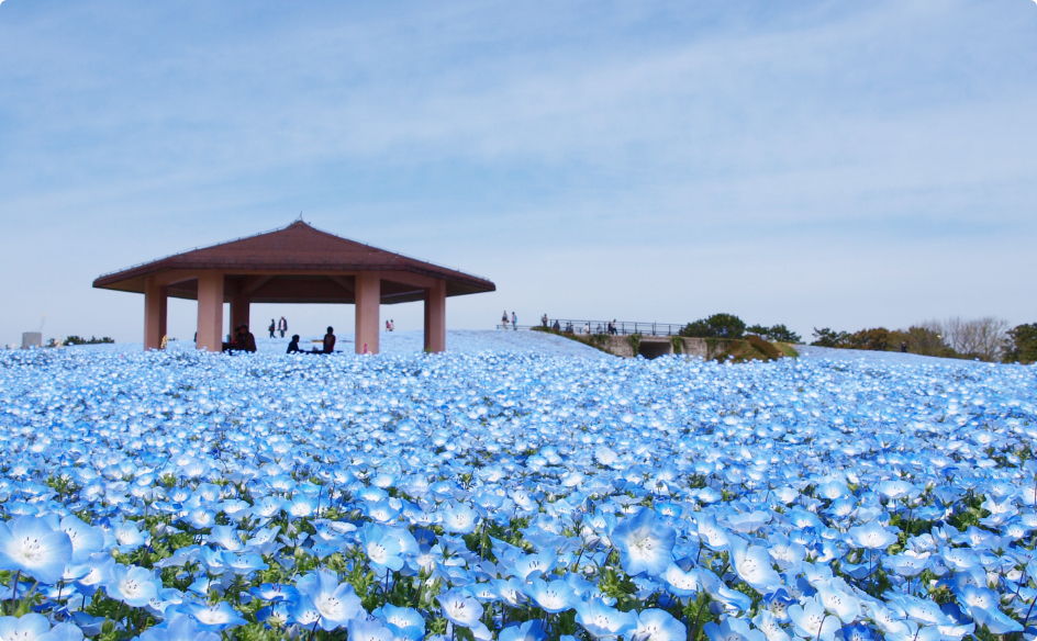 マリンワールド海の中がある海の中道海浜公園は、博多湾と玄関灘に挟まれた砂州にある国営公園。広大な公園内にはサンシャインプールや大芝生広場、動物の森、バラ園などがあり、特に季節折々のお花は必見です(写真は4月上旬から下旬が見ごろのネモフィラ)。福岡サンパレス ホテル&ホールとは博多湾を挟んで対岸にある海の中道。博多湾を船で渡る海路で行くのがおすすめ。ベイサイドプレイス博多より出港する高速船「うみなかライン」の往復乗船券とマリンワールド海の中道の入館料がセットになったお得なチケットも、福岡サンパレス ホテル&ホールのフロントにて販売しておりますので、ぜひご利用ください。