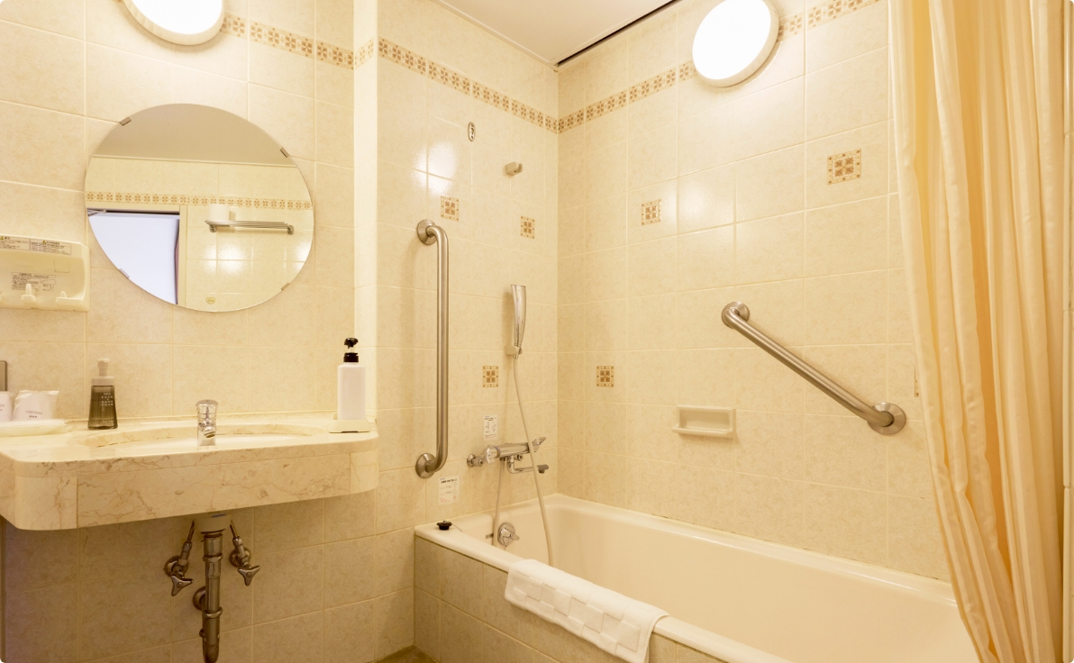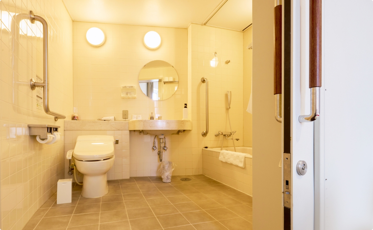 お部屋、バスルームのドアが引き戸になっており、トイレ及び洗面台に手すりを設置、シャワースペースにも手すりを設置していて、バスタブはまたぎやすい高さです。