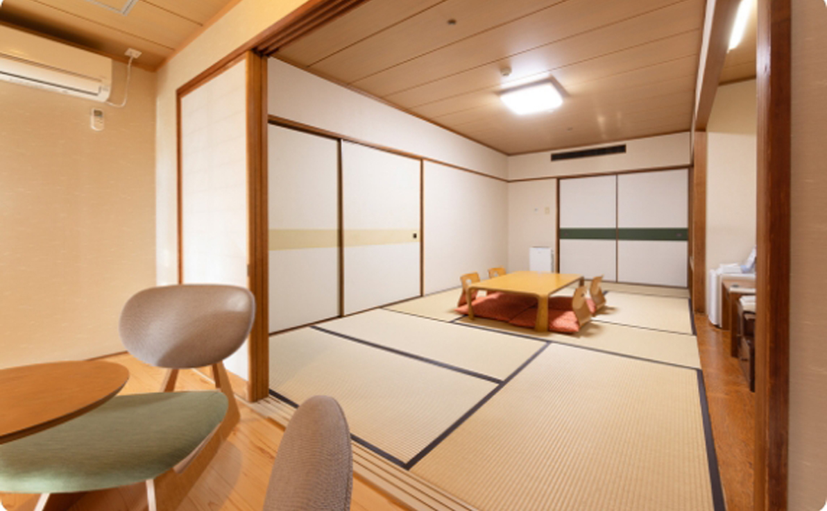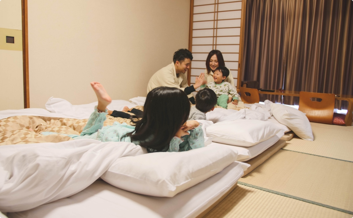 畳のお部屋でゆったりとくつろぎながら、お布団で快適にお休みいただけます。小さなお子様連れのお客様や、ご友人とのご旅行に特にご好評いただいているお部屋です。